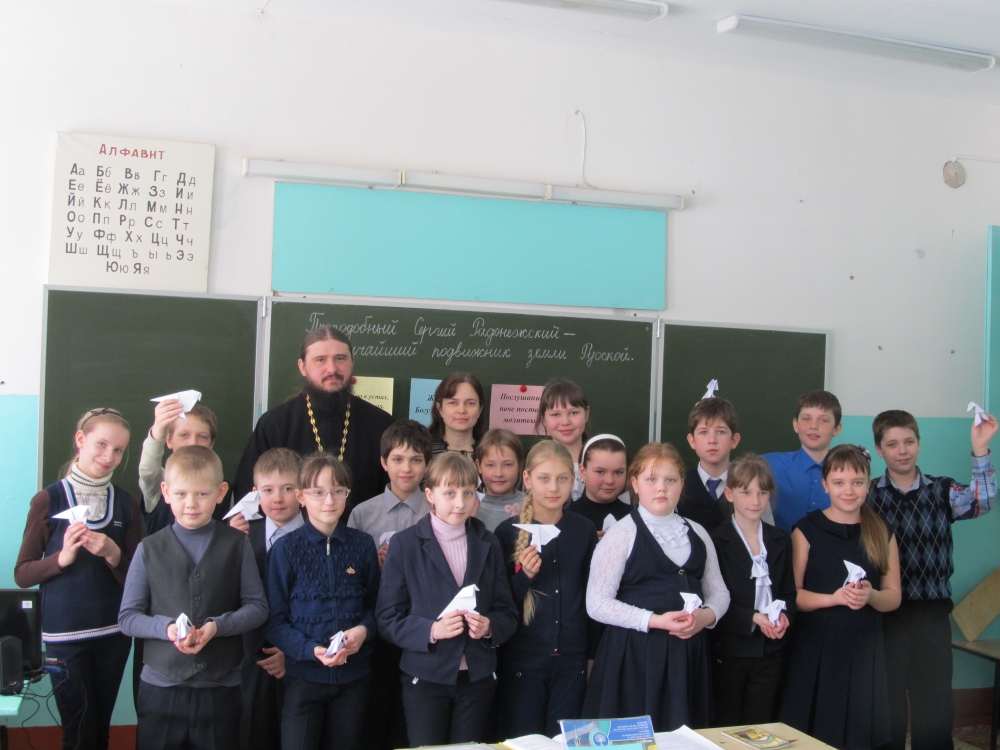 На память об этом занятии дети получили в подарок фигурки бумажных птиц, напоминающих тех, которые слетелись(*) к окну преподобного Сергия, символизируя собой его прекрасных учеников.