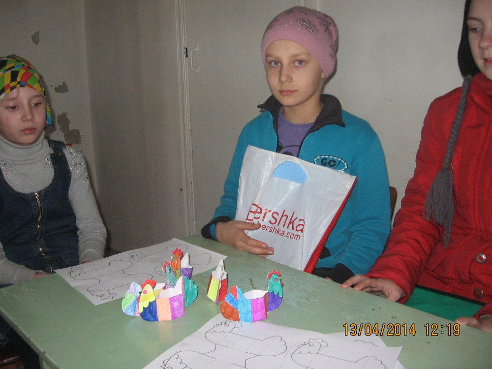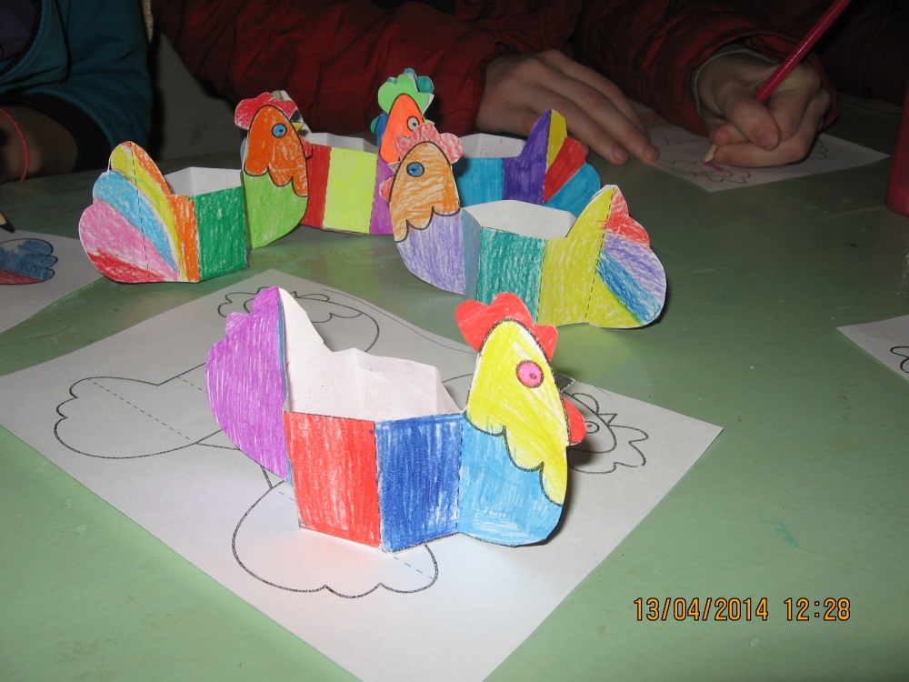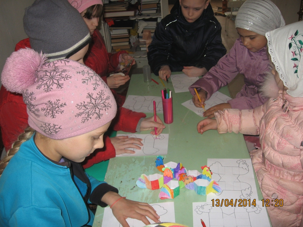 Дети и взрослые вместе, своими руками, делают подарки — подставки в виде курочек для пасхальных яиц.