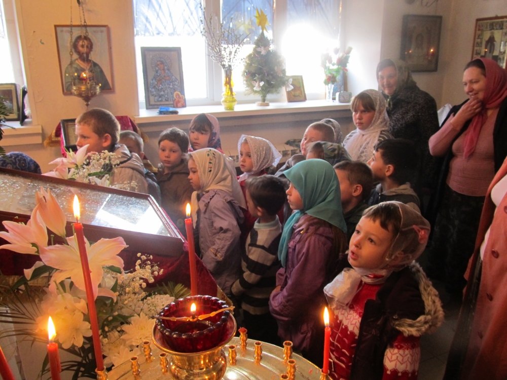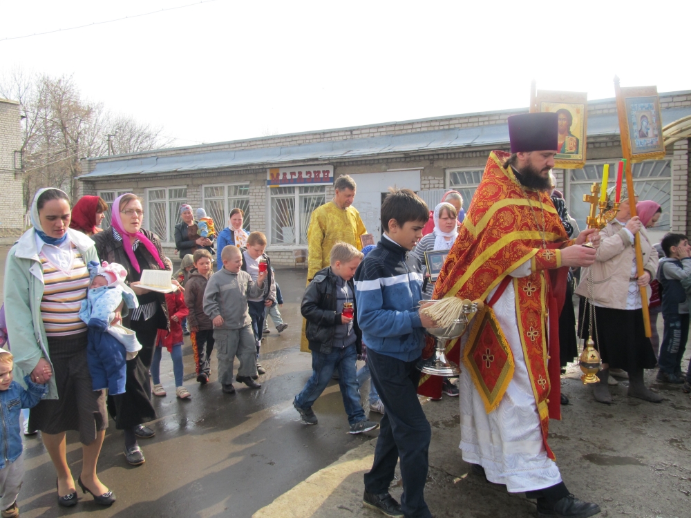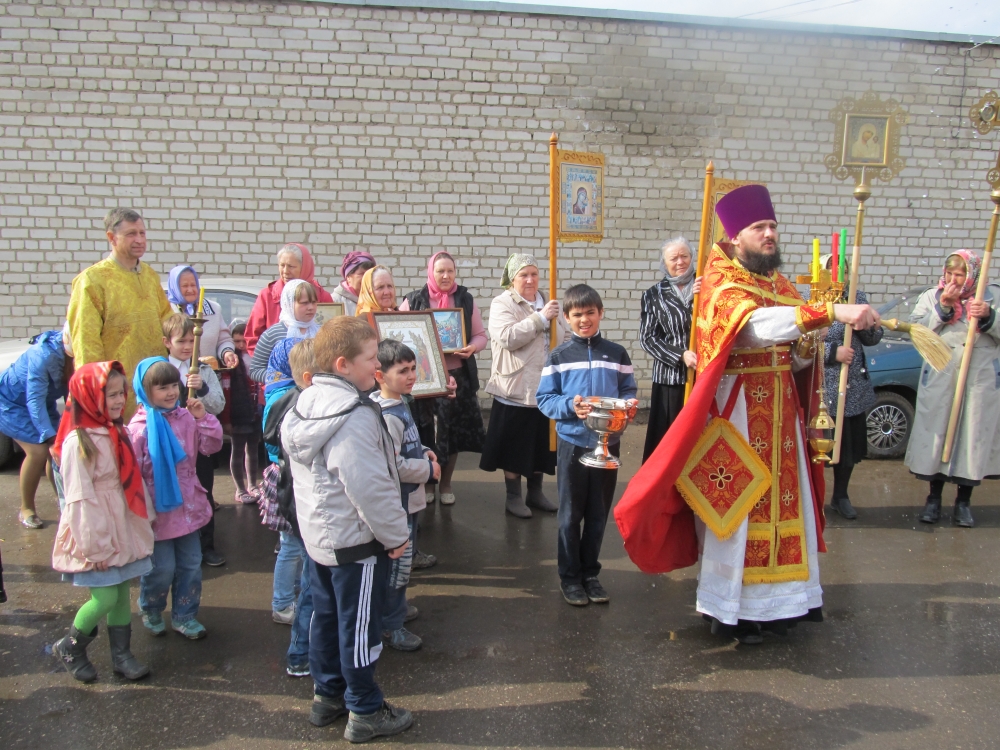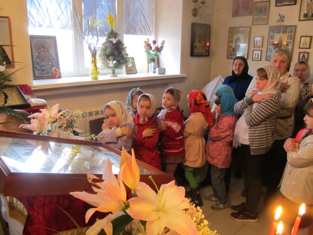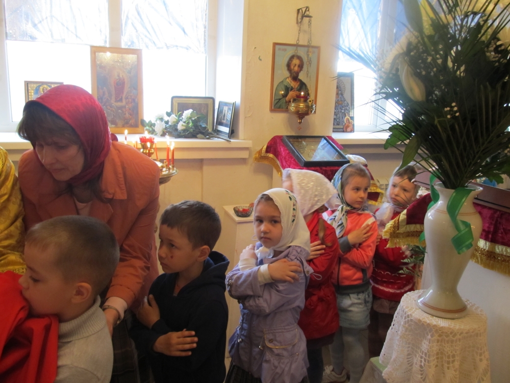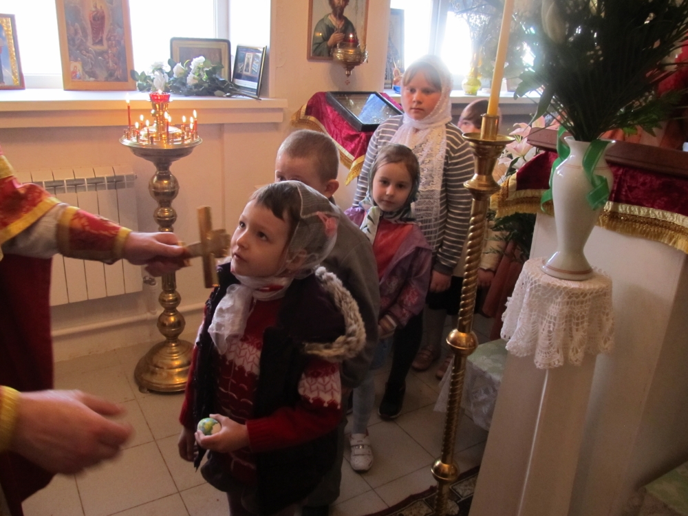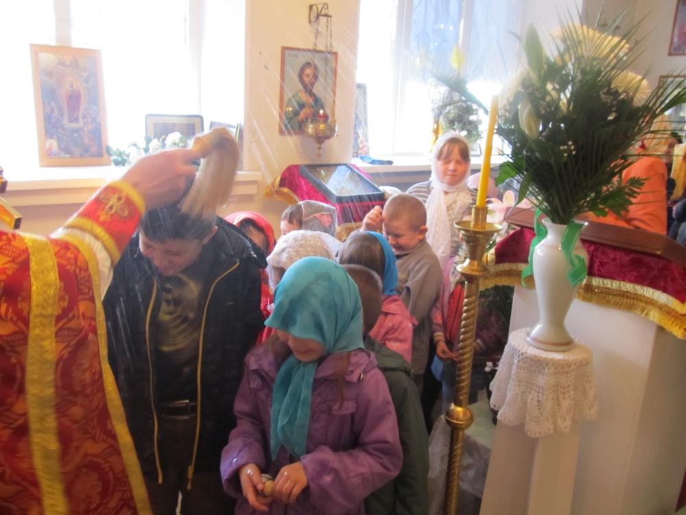 По окончании службы, ребята, подходя к кресту, получили от батюшки Пасхальное яичко, и в свою очередь вручили ему открытку к Светлому Празднику, изготовленную своими руками. С восторгом они восприняли окропление Святой водой.