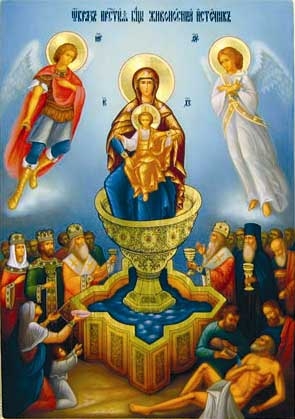 В этот день совершается чин водоосвящения с пасхальным крестным ходом. На иконе пресвятая Богородица с Богомладенцем изображены над громадной каменной чашей, стоящей в водоеме. У водоема, наполненного животворной водой, изображены страждущие телесными недугами, страстями и душевными немощами. Все они пьют эту живительную воду и получают различные исцеления.