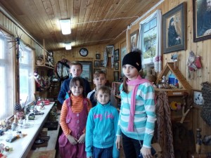 Далее экскурсия продолжилась в музее Пощуповской игрушки. Находится музей в доме семьи Ивановых. Глава семьи Владимир Иванов — художник. Он пишет картины и иконы, а также помогает своей супруге — игрушечнице Ирине Ивановой в оформлении игрушки.